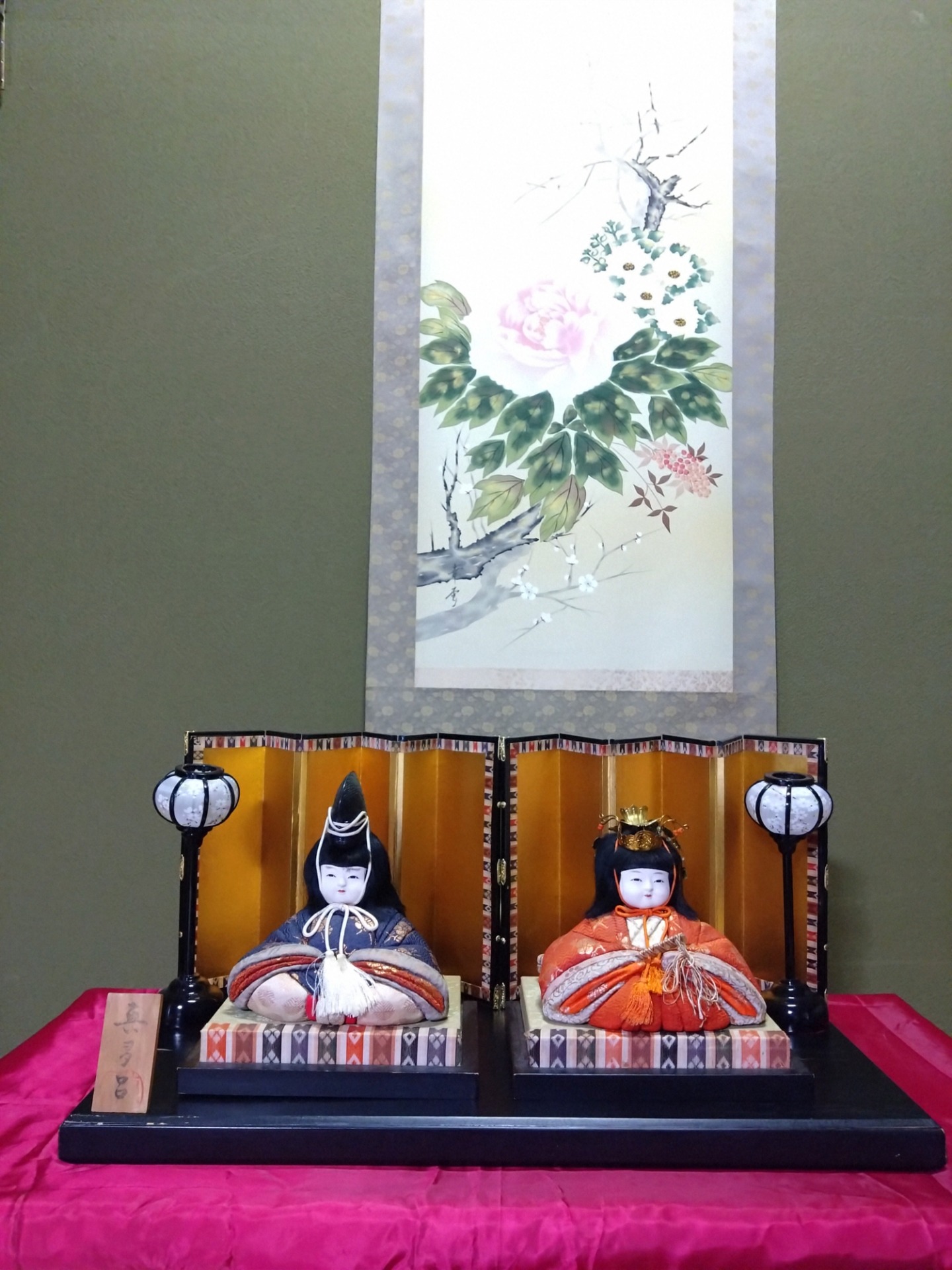 お父さん(義理の父)からいただいた雛人形と 可愛らしい桃色の蕾をつけた思い出の小梅の枝を飾りました